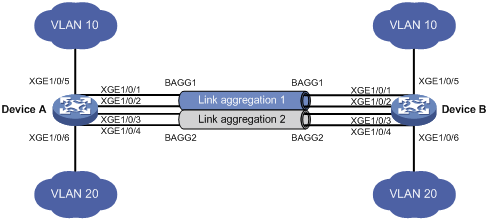 · 在Device A和Device B上分别配置两个二层静态链路聚合组,并使两端的VLAN 10通过二层聚合接口1互通、VLAN 20通过二层聚合接口2互通。