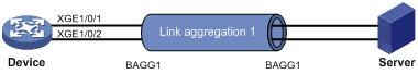 · Device与服务器Server通过Ten-GigabitEthernet1/0/1、Ten-GigabitEthernet1/0/2相互连接。