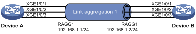 · Device A与Device B通过各自的二层以太网接口Ten-GigabitEthernet1/0/1~Ten-GigabitEthernet1/0/3相互连接。