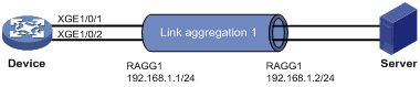 · Device与服务器Server通过端口Ten-GigabitEthernet1/0/1、Ten-GigabitEthernet1/0/2相互连接。